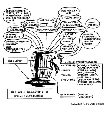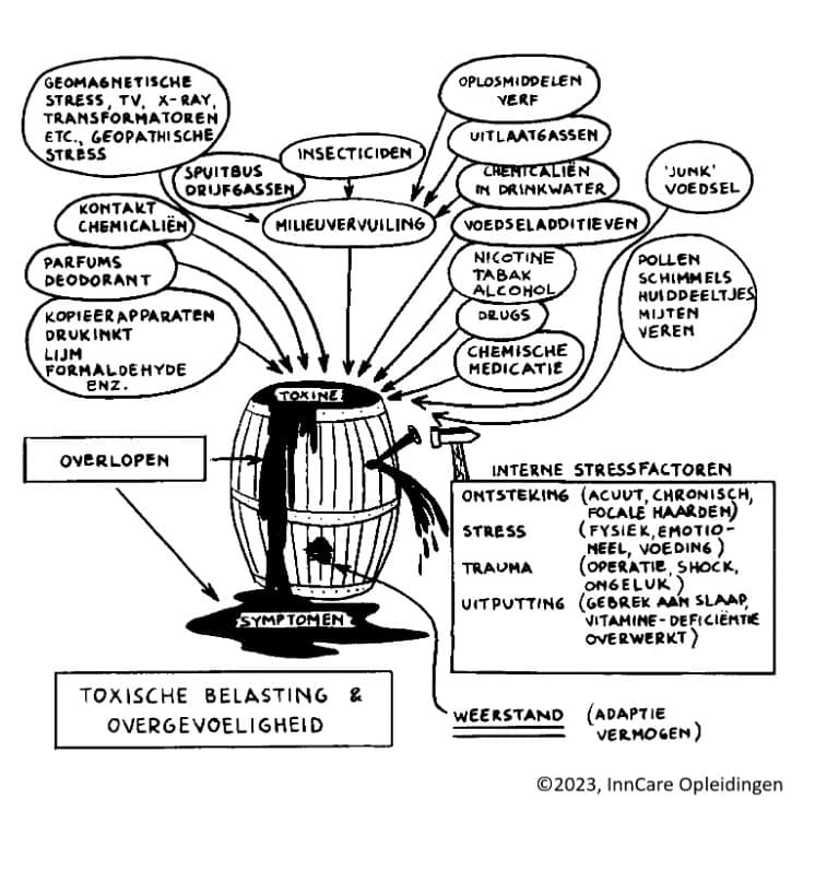 Misschien is het niet nodig en heb jij net als ik en veel van mijn cliënten baat bij een kijkje in ‘jouw vat’ (check de tekening hieronder) . Om te zien welke (over)belasting er in jouw systeem zit en voor welke klachten dat zorgt. Vaak zit er onder de jou bekende allergie namelijk een andere die behandeld moet worden (en die vinden ze dus niet met een reguliere allergenen test in het ziekenhuis) Jouw onderbewustzijn geeft namelijk feilloos aan waar het als eerste vanaf moet om symptoomverlichting te bereiken.